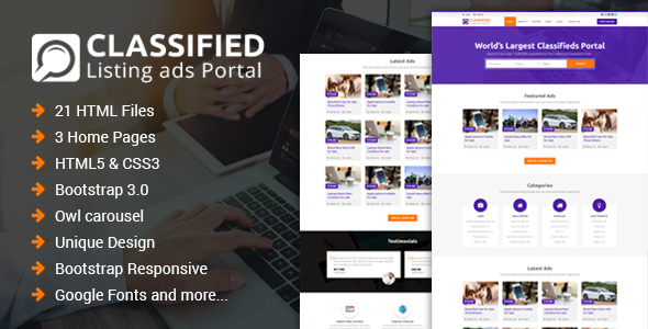 Classified is a wide-ranging HTML template. It is a creative business template ideal for classified, E-commerce, Listings (Ads, Products etc.) or any other digital marketing related business. It has been built with the latest web technologies and standards. The layout is drag responsive and looks attractive at all screen sizes whether it is a desktop, laptop, tablet, or mobile. Template is bug free and has been tested on all web browsers. It has many features and can be integrated to any development platform/framework. It can be customized in a very easy way.