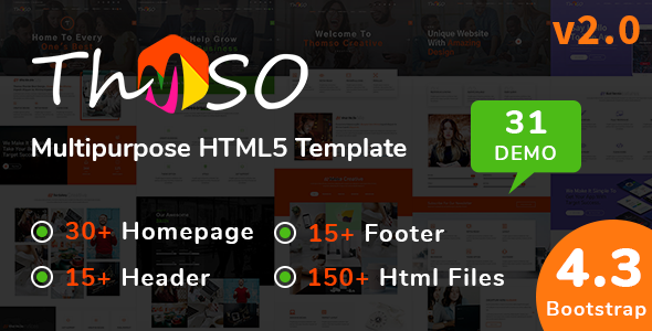 Thomso is a beautiful Multi-purpose responsive HTML5 template with most advanced features with modern UI design, It is professional. 30+ Homepage templates are included in Thomso. smooth and sleek, with a clean modern layout. Thomso is suitable for Agency, Freelance, Business, Blog, Portfolio, Photography, corporate and More. Simple and Easy to Integrate, high quality and flexible layout in bootstrap, responsive menu and various layouts included. This template is very well commented and also have proper help documentation to customize it easily.