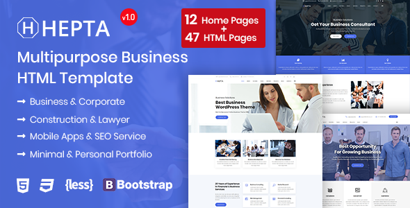 Hepta is a creative, modern and unique Responsive Multipurpose Business. It’s perfect for any Business, Financial, Consulting, Insurance, loan, Tax help, Investment Firm, Creative Business, Corporate, Company, Individual sites, Fitness, Gym, Trainer, Personal or Freelancers Portfolio, Minimal Portfolio, Constructions, Renovations, Medical etc. to show their services, projects/portfolios and other information to their customers.